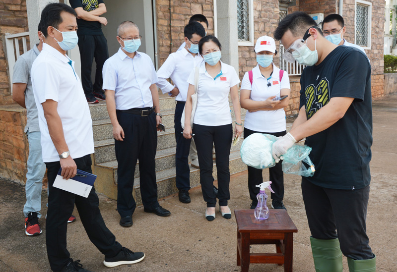 随后,双方开展了防疫应急演练。演练方案假设一名员工出现发热乏力等疑似症状,应急处置人员按照应急方案开始采取措施,包括发现并报告员工情况、隔离发热员工、启动应急预案、排查并对密切接触人员进行隔离观察、联络医疗队进行远程诊断、现场消杀作业、报送代表处及疫情防控办公室、转运送往定点医院进行诊断、在检测排除新冠后上报诊断结果和接下来的处置程序等环节。援喀医疗队专家一行全程参与和记录,并在每个环节给出指导意见。